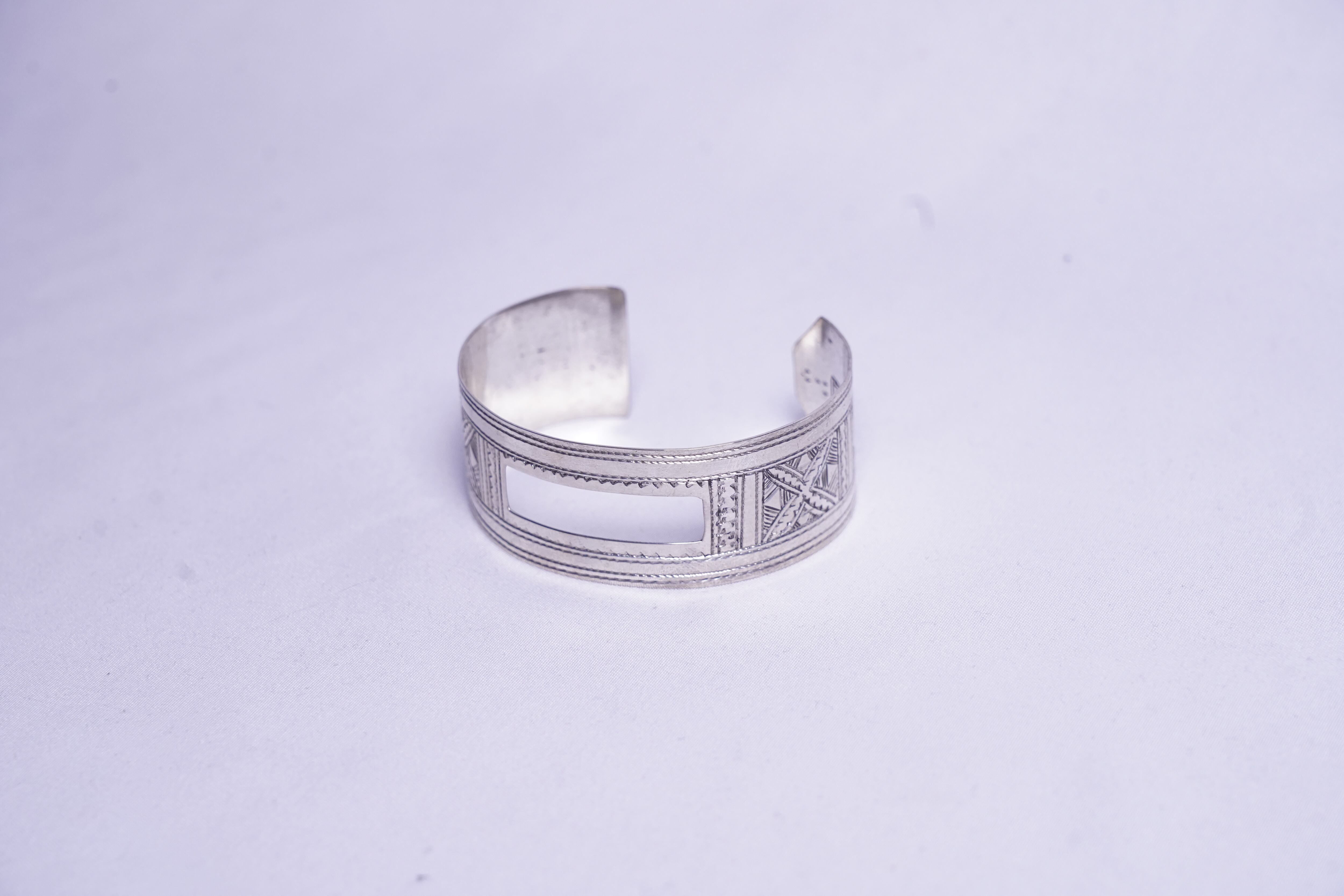 中央のくり抜きデザインが特徴的な、トゥアレグシルバーのバングル。